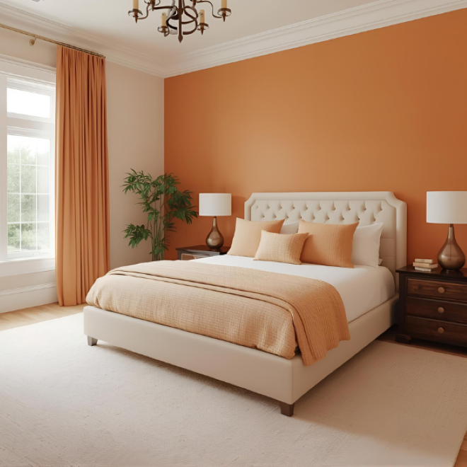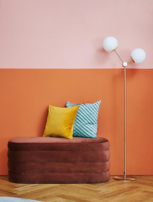 As we saw with the Barbiecore makeover, it’s important to use enough soft tones to create a sense of calm. That’s why we’d go for an accent wall in Sigma Orange Poppy or Sigma Blaze of Glory.